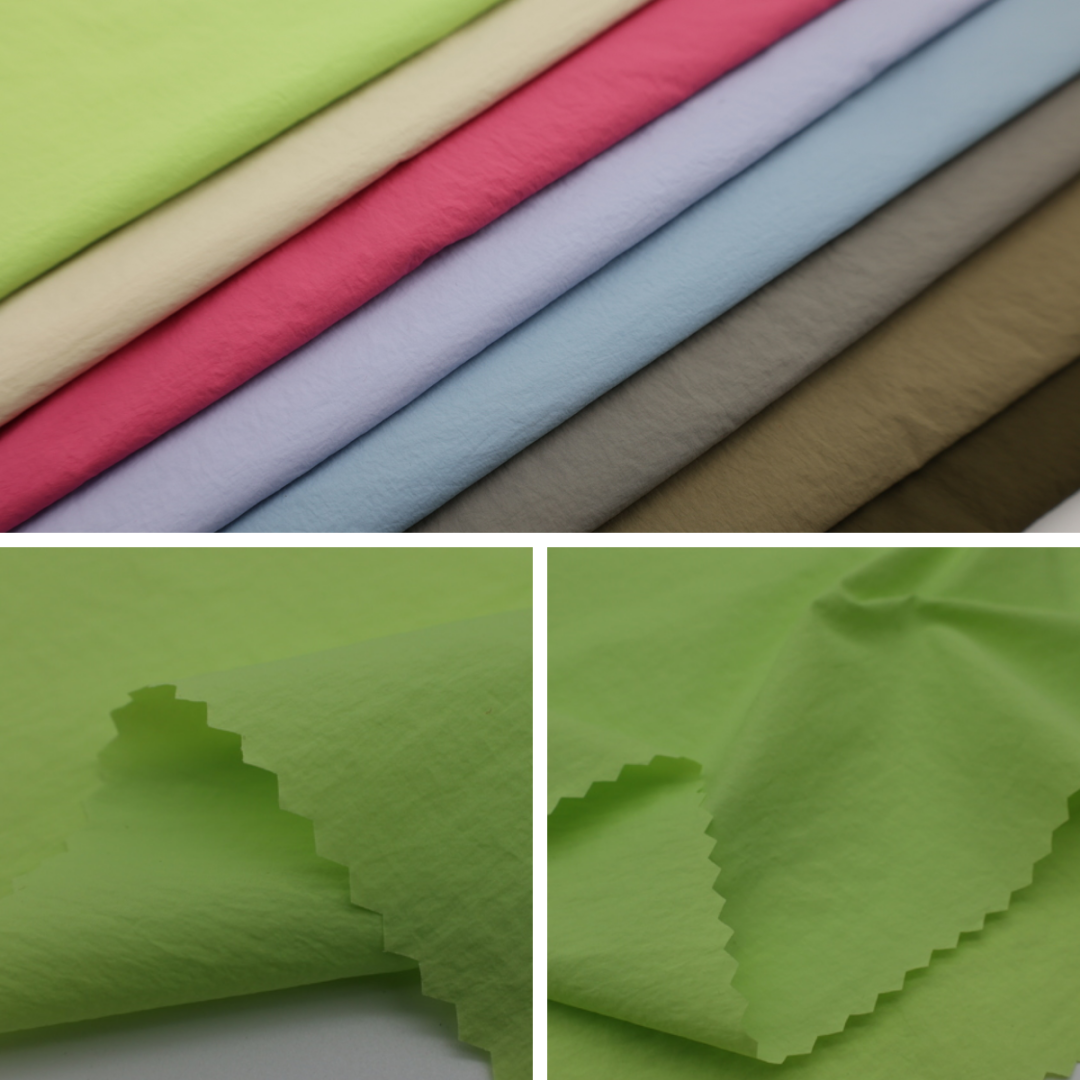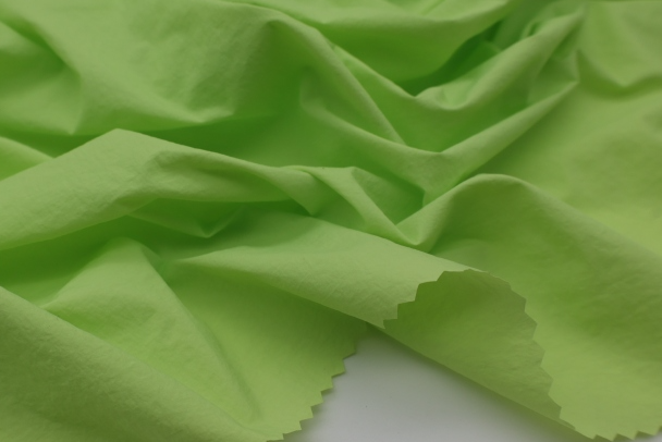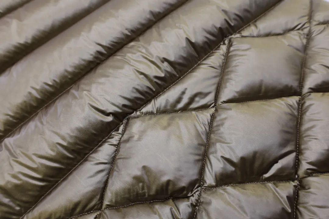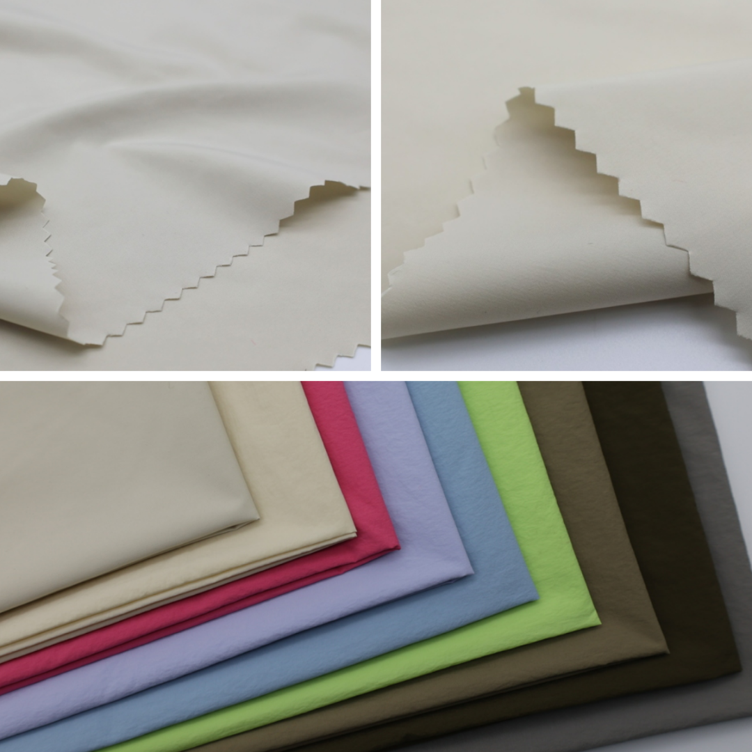 這款是100%尼龍材質(zhì),可經(jīng)過壓光、貼膜、燙膜、復(fù)合、涂層等后處理工藝,可實(shí)現(xiàn)無膽防絨。手感超柔親膚,略有微皺風(fēng)格,輕薄且有骨感。用于女裝羽絨服、風(fēng)衣夾克、皮膚衣。