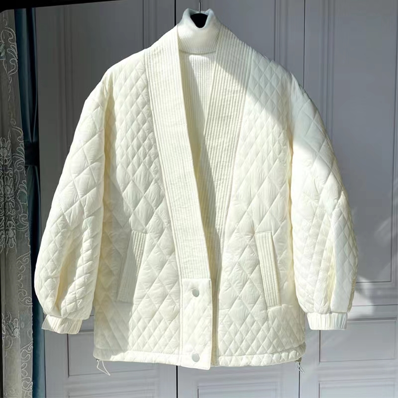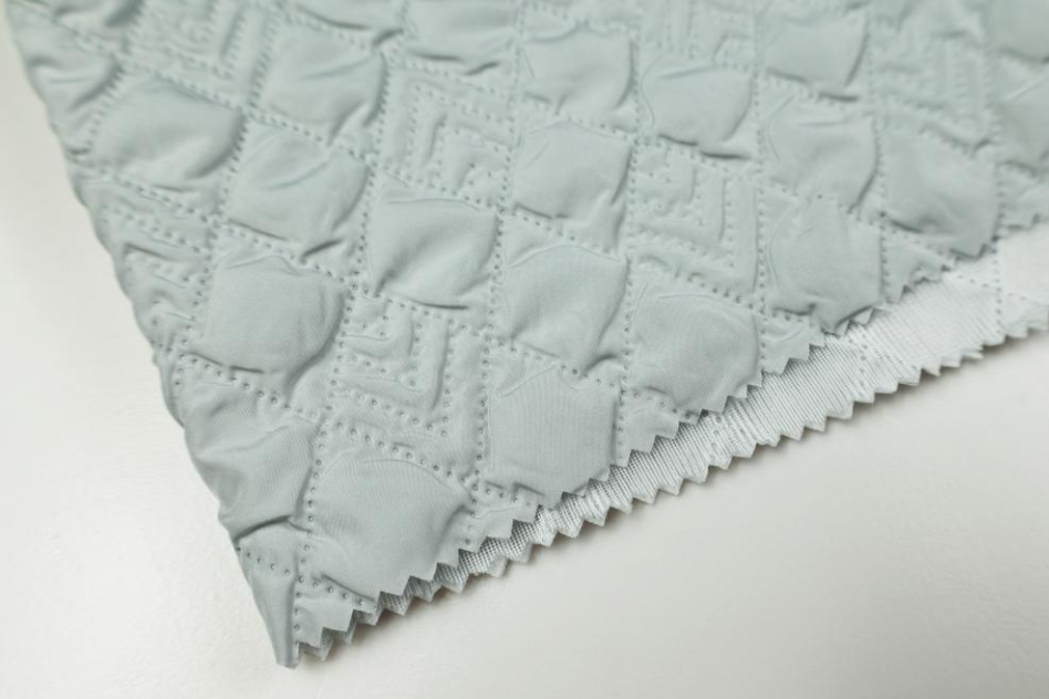 產品原料上應用的是多孔聚酯纖維加彈絲,面料的密度是性價比較高的310T;手感柔軟細膩,具有絨感;后續做壓皺工藝,菱形幾何花型與輕薄填充物之間相呼應,凹凸不平的壓皺風格突出面料的立體氛圍,豐富人們的視覺體驗,為單調的防寒面料上增添幾分趣味與文藝。