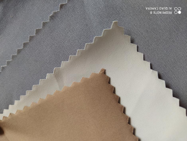 第一款是滌綸消光高彈面料(CPT224005),100%滌綸,成本相對氨綸包覆絲低,全滌染色色牢度較好。染色成品以后,手感挺闊爽滑,具有彈力。經后整理方式處理后,透濕性好,具有防水功能。